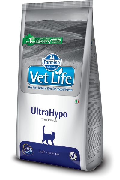 Farmina Vet Life UltraHypo istenmeyen gıda reaksiyonları (gıda alerjisi ve intoleransları) olan kediler için tam diyetetik mamadır. Bir tanı aracı (eliminasyon diyeti) olarak kullanılabilir; kronik inflamatuar bağırsak hastalığı (İBH), tekrarlayan kusma sırasında önerilir.